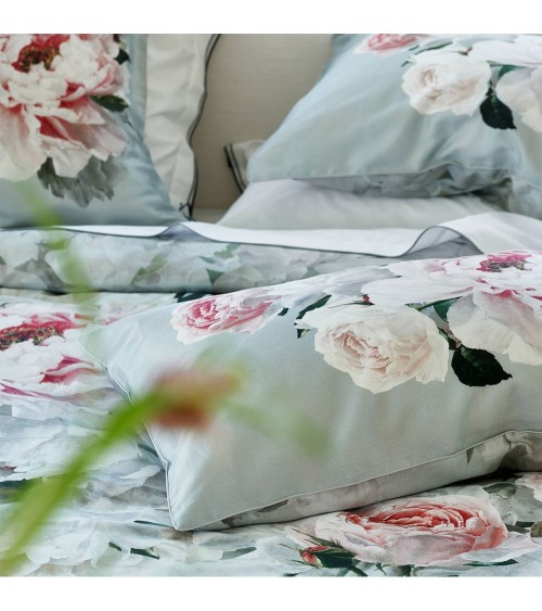 Le modèle Peonia Grande a un motif floral au rendu photoréaliste illustrant de grandes pivoines peintes à la main disposées sur un fond gris délicat. Ce modèle est une impression ton sur ton de pivoines grises. Les taies doreiller sont réhaussées dun passepoil gris.