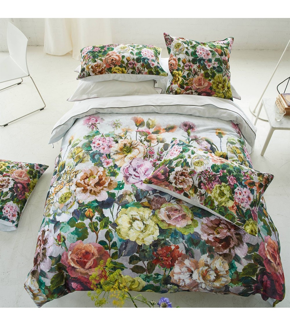 Le modèle Grandiflora représente une peinture aquarelle d'une célébration de fleurs printanières grandioses inspirées des jardins anglais. Le revers reprend le contre fond de la face principale, taies doreiller finies avec un élégant passepoil.
