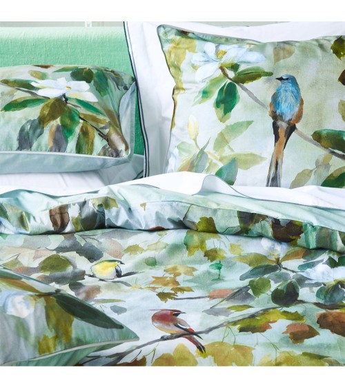 Le modèle Maple Tree, aux feuilles et magnolias en fleurs peints à laquarelle créent ce merveilleux motif de linge de lit imprimé sur de la percale de coton 80fils/cm². De jolis oiseaux viennent sublimer cette scène. Taies doreiller finies par un élégant gros grain gris.