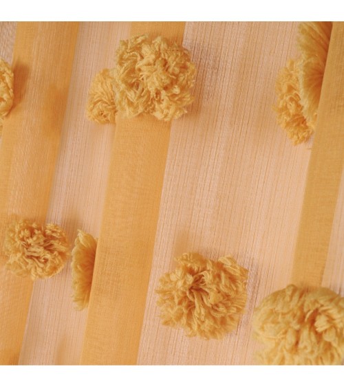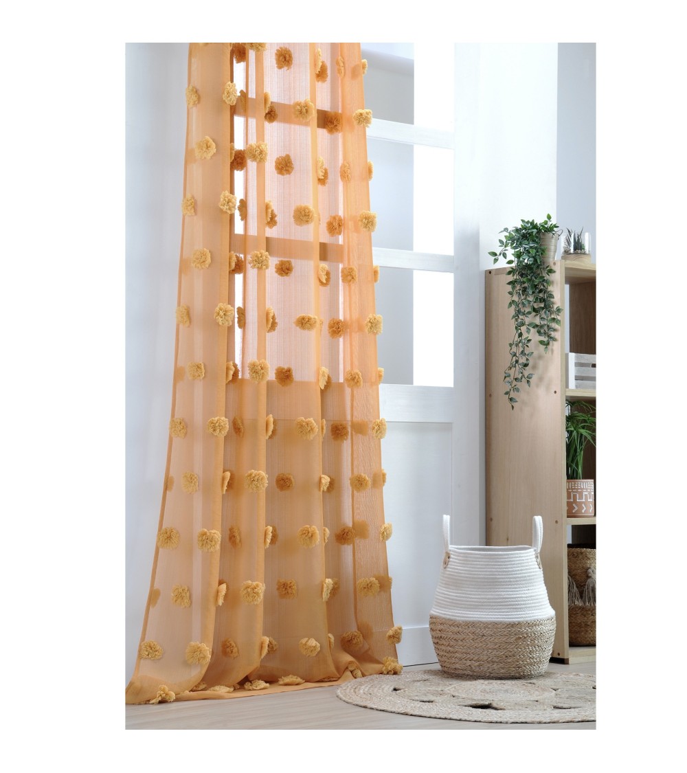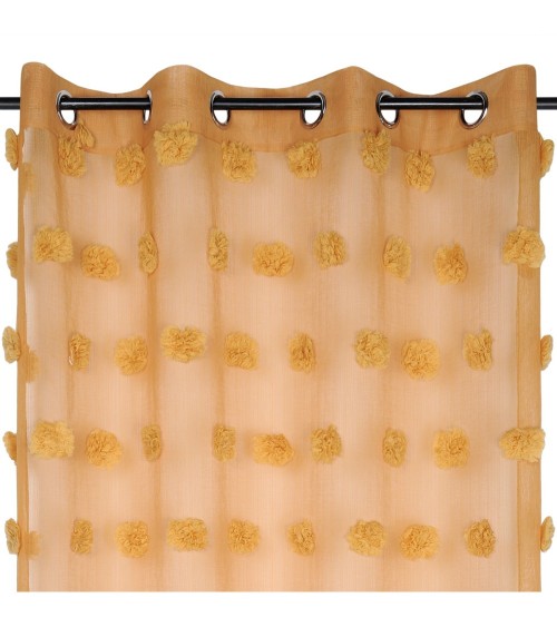 Ambiance ethno bohème avec ce voilage coloré au multiples pompons ton sur ton. . Ce panneau est uni et unique avec une note de fantaisie qui plaira aux plus ''originaux''. Celui-ci laissera traverser la lumière et vous protégera des regards indiscrets. Lavage en machine à 30°. . Caractéristiques:. Dimension : 140 x 260 cm. Finition : 8 oeillets ronds en coloris argent avec une bande de renfort. Composition : 100% polyester. Coloris : moutarde, poudre, blanc et perle. . Vendu à l'unité. Prêt à poser