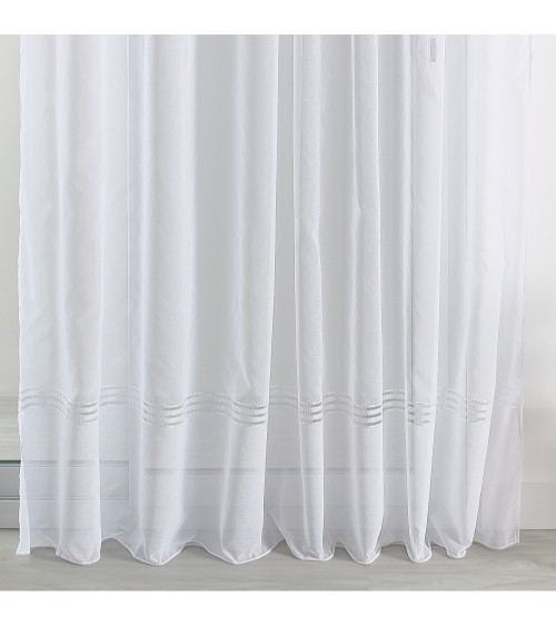 Ce voilage fantaisie propose un parement bas à fines rayures horizontales, qui apportera de la profondeur à votre pièce. Ce modèle prêt-à-poser est équipé d'un galon fronceur de 70 mm. Dans les tons de blanc et de crème, il s'adaptera facilement à la décoration de votre intérieur. Il laissera pénétrer les rayons du soleil, tout en préservant votre intimité des regards indiscrets. Ce voilage est disponible dans de multiples dimensions. . Caractéristiques : . Composition : 100% polyester. Finition bas : plombé. Finition côtés : ourlés. Finition haut : galon fronceur de 70 mm. Dimensions : 240 x 240 cm, 300 x 240 cm, 420 x 240 cm. Voilage vendu à l'unité. Prêt-à-poser.