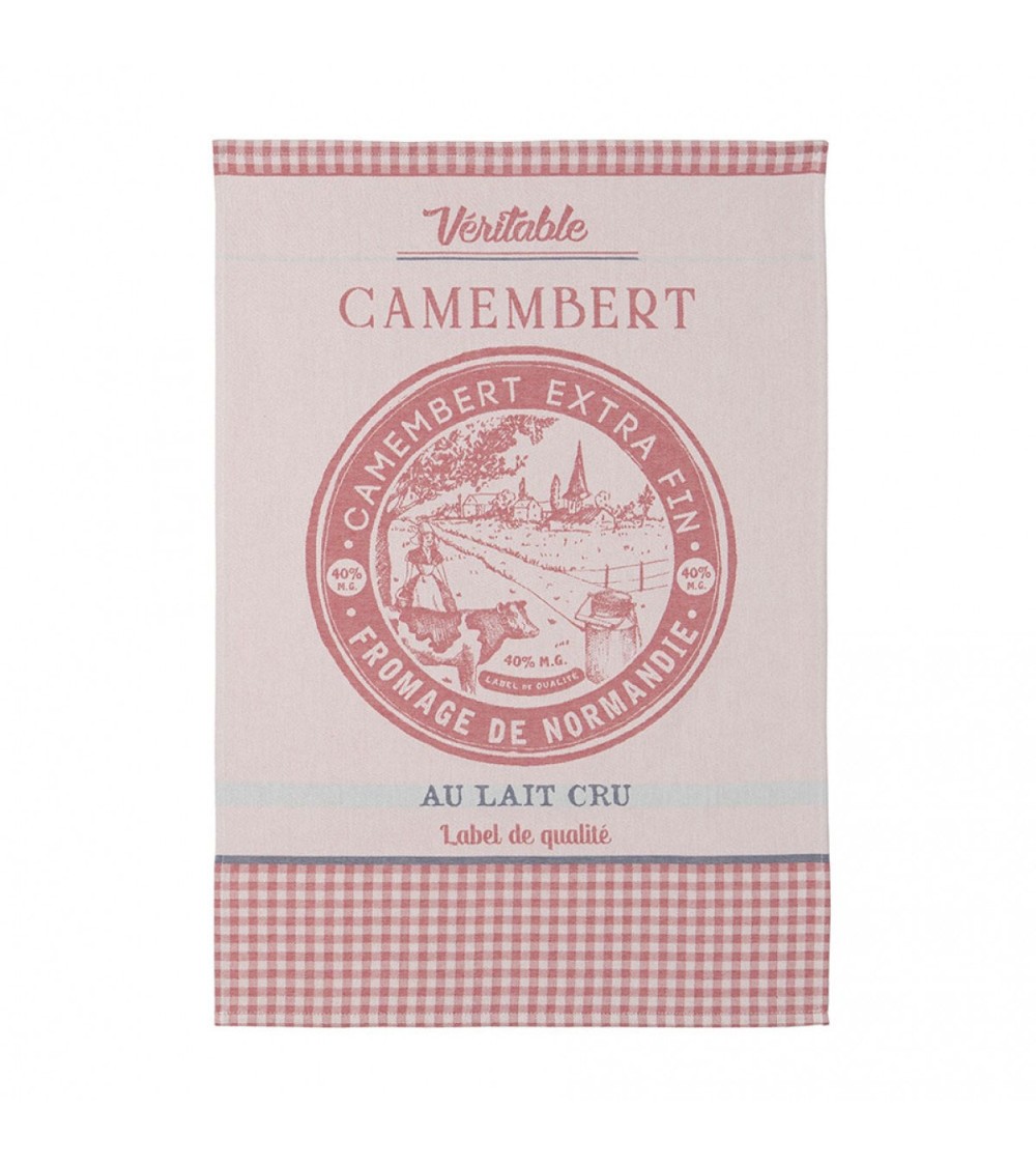Torchon de cuisine, en jacquard de coton orné d'un camembert sur un fond blanc et rouge, pour une ambiance delices salés.