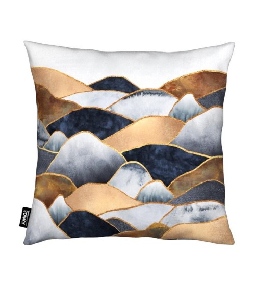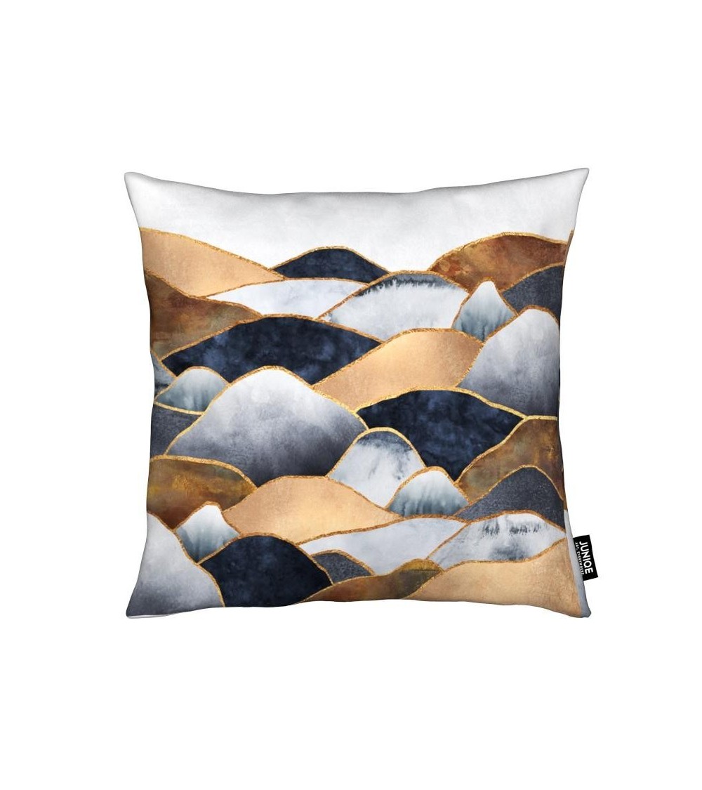 Housse de coussin imprimée en continu (all-over) avec son coussin de garnissage. Matière hypoallergénique. Peut être produit en trois tailles différentes. Porte une fermeture éclair.