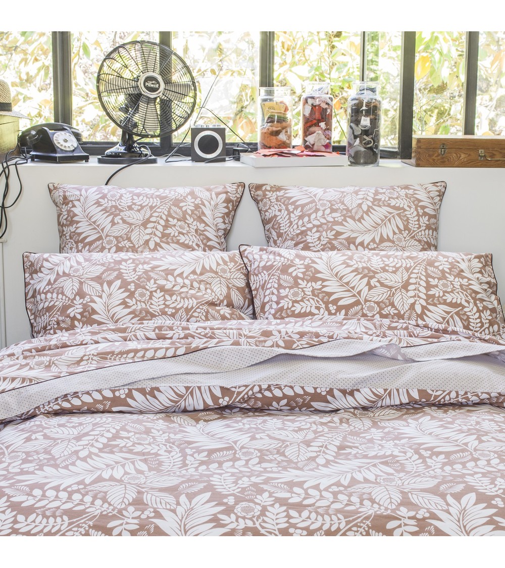 La housse de couette LILE ROUSSE Sinspire de lArt déco avec ses végétaux stylisés. Ce modèle de housse de couette classique offre beaucoup de finesse et de précisions, sur un support percale assez mat qui absorbe vite les couleurs. Le revers de cette parure de lit renforce ce coté moderne grâce à son micro motif cravate terracotta imprimé sur un fond naturel. Cette parure de lit végétal en percale de coton ne nécessite pas ou peu de repassage grâce à son traitement easy-care.