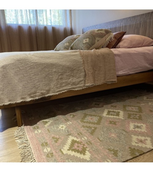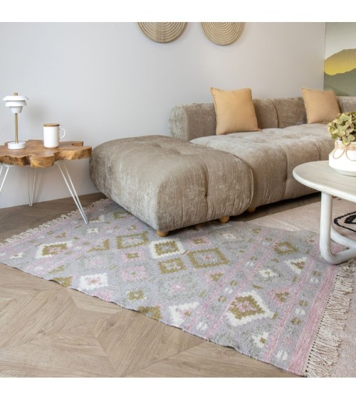 Avec ses motifs géométriques et son look ethnique affirmé, le tapis kilim en laine et coton 150x100 BLUSH sera parfait pour donner du cachet à votre déco bohème. Ses atouts ? Il mise sur ses teintes nuancées colorées pour réchauffer la pièce, ses parties en relief tuftées, ses pompons et ses franges tressées sur les bords pour apporter un côté traditionnel au salon. Tapis kilim rose 60% Laine - 30% Jute - 10% coton Dimensions: 150x 100 cm Nettoyage professionnel