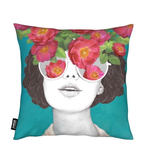 Housse de coussin imprimée en continu (all-over) avec son coussin de garnissage. Matière hypoallergénique. Peut être produit en trois tailles différentes. Porte une fermeture éclair.