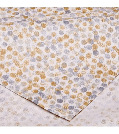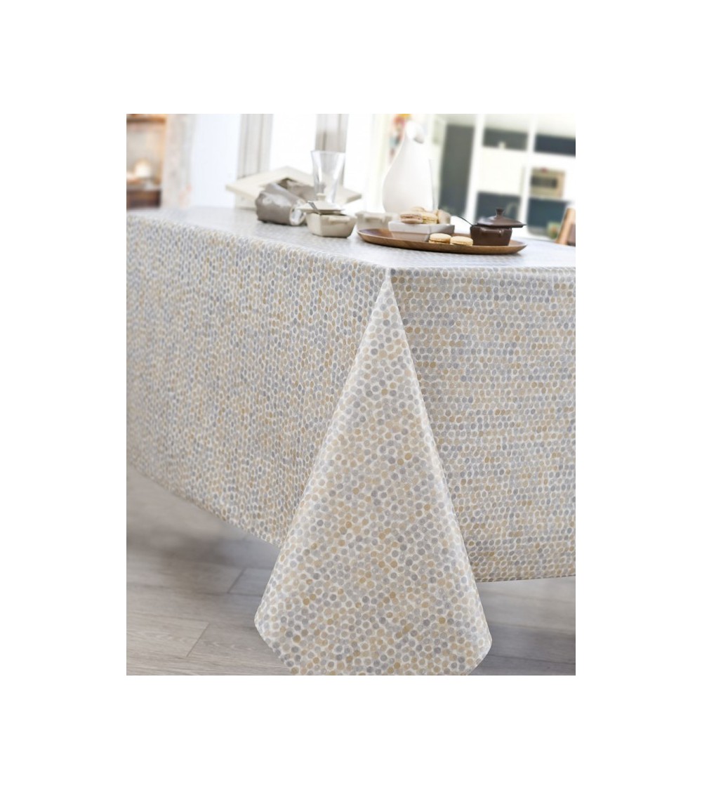 L'enduction acrylique est dotée d'une couche de téflon et d'une couche de résine fluorée bio qui se réactive au repassage. L'enduction assure un entretien facile, un coup d'éponge suffit ! Le traitement déperlant permet au liquide de glisser sur la surface de la nappe