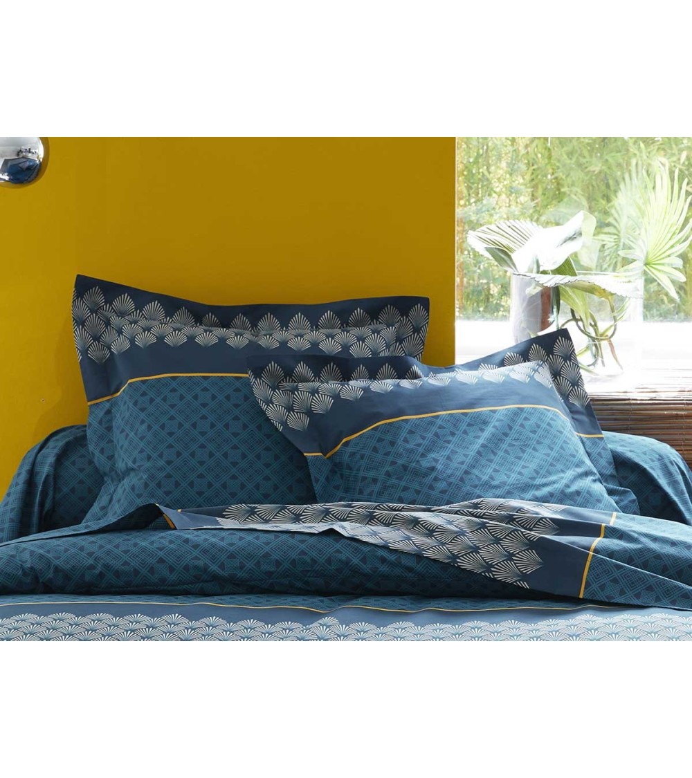 Fabrication Française. Ambiance ''Art Déco''. Taies d'oreiller à volant plat . 2 dimensions : 65 x 65 cm et 50 x 70 cm. Taies en 65 x 65 cm sont à volants plats imprimée de motifs géométriques sur le bas et de coquillages sur le haut. Une fine rayure horizontale fera la jonction entre les 2 parties en coloris jaune. Le 50 x 70 cm est à petits motifs géométriques bleu sur fond marine sur la totalité de la taie. Composition en 100% coton avec un tissage fin et sérré de 57 fils/cm2 ce qui ajoutera du confort et de la tenue à vos taies. Lavage en machine à 40°. Belle qualité qui durera au fil du temps. A vous de créer votre propre parure avec housse de couette, drap plat, drap housse assortis dans cette même gamme. Caractéristiques:. Composition : 100% coton en 57 fils/cm2. Dimensions : 65 x 65 cm et 50 x 70 cm. Coloris : bleu. Finition : volant plat.  . Vendue à l'unité