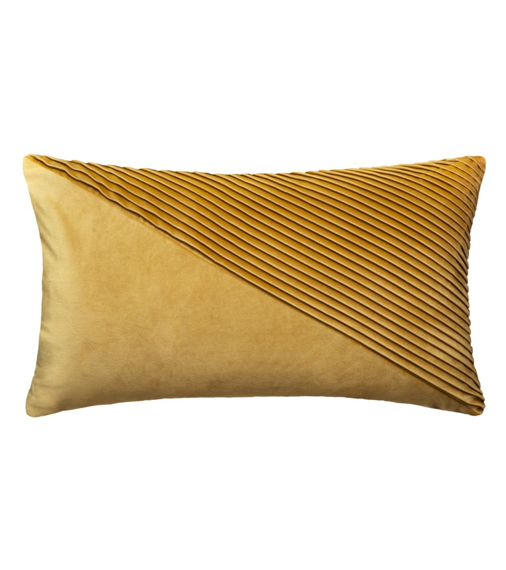 Ce coussin déhoussable de 30 x 50 cm apportera un côté chic à votre intérieur. Sa texture en velours est douce et très agréable au toucher. Des plis présents sur la moitié du coussin apportent de la texture et de l'originalité. Une fermeture en zip permet de le déhousser facilement. . Caractéristiques :. Dimensions : 30 x 50 cm. Composition : velours en 100% polyester . Finitions : zip, plis. Coloris : jaune ocre, gris, bleu canard. Lavage : 30°C. . Vendu à l'unité
