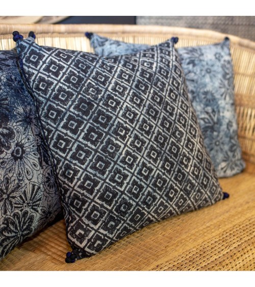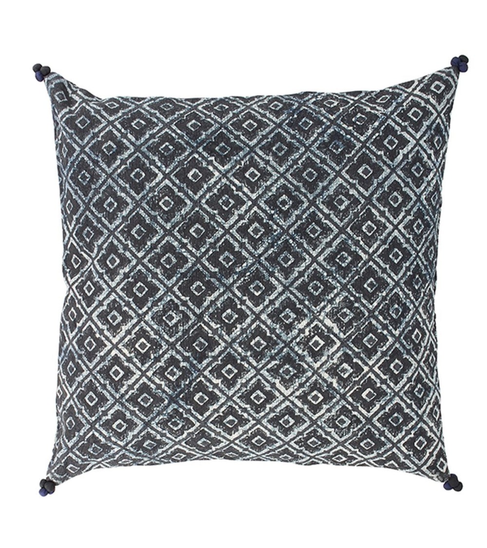 Adoptez ce coussin imprimée bleue et noire, elle sera un vrai plus pour votre salon ou votre chambre. Matière : housse 100% coton , 4 pompons, ouverture fermeture éclair + intérieur 100% polyester Coloris : imprimé Bleu et Noir Dimensions 45x45cm Usage intérieur ou extérieur abrité, ne pas exposer directement aux intempéries. Lavage à 30°C et ne pas sécher en machine