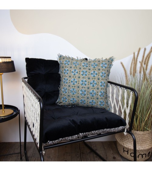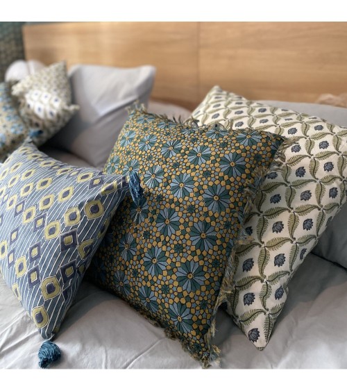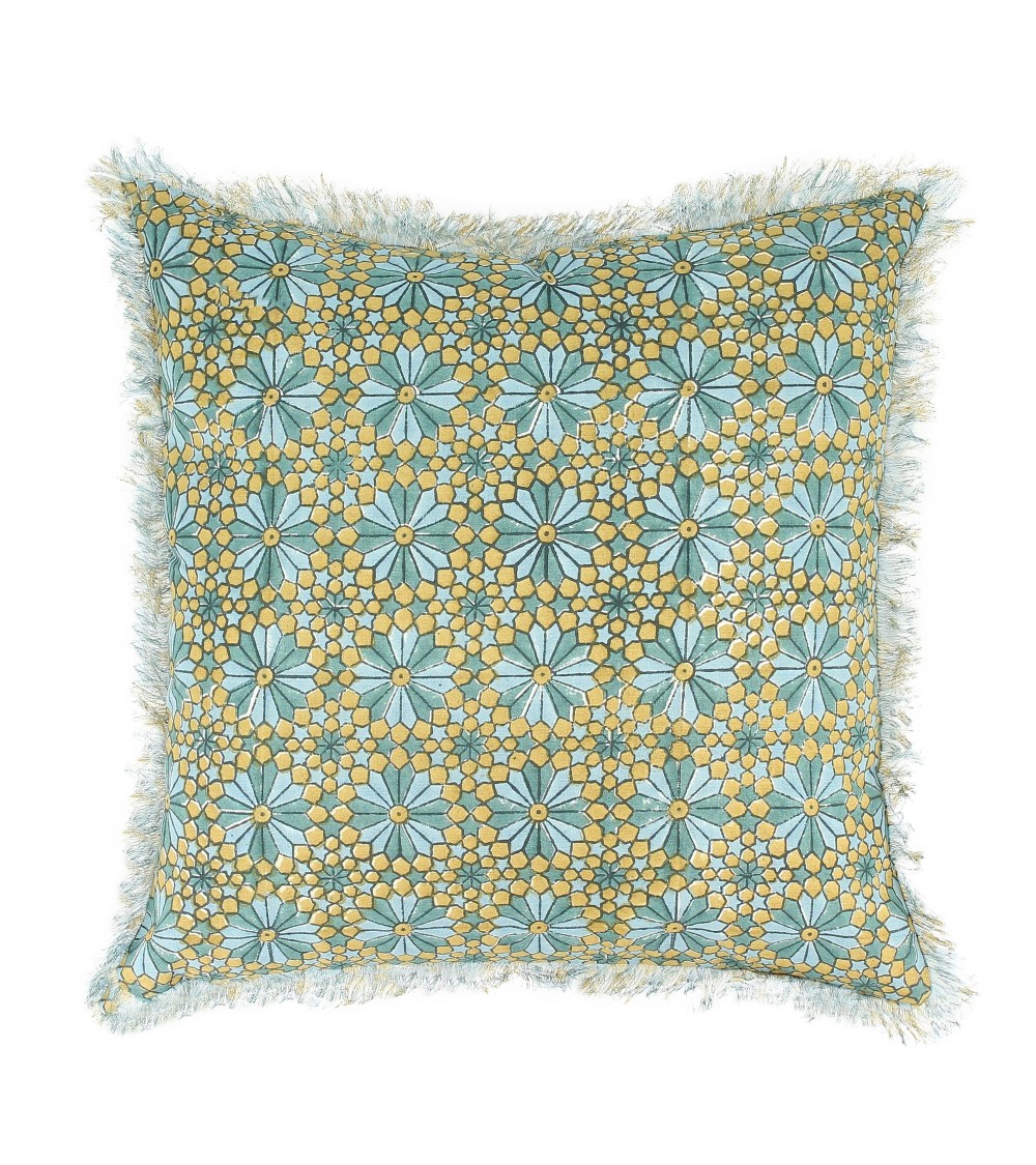 Coussin en coton imprimé avec franges bleu et vert 40x40