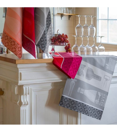 De la taille à la récolte les outils incontournables s'exposent sur le torchon Vin en grappe et se coordonnent aux millésimes et tire-bouchons du torchon Vin en bouteille. Rouge, Rosé et palette de gris font les variantes de ce thème sur le vin*.Le torchon, en coton et aux dimensions généreuses de 60x80cm, a une étiquette tissée pour l'accrocher facilement dans votre cuisine. Nos produits sont tissés en 100% coton, peigné longues fibres, pour vous garantir une qualité supérieure. Les fibres les plus longues produisent un linge au toucher doux, parfaitement lisse et résistant ; la finesse des fils peignés apporte une brillance et une précision incomparable à nos motifs.Parce qu'avoir confiance dans nos produits est primordial, Le Jacquard Français fabrique des produits bénéficiant du label STANDARD 100 d'OEKO-TEX. Créée en 1992, ce label international indépendant garantit un usage limité et strictement contrôlé de substances dangereuses pour la santé et l'environnement lors de la confection de textiles et ce, à tous les stades de sa transformation. *Labus dalcool est dangereux pour la santé. À consommer avec modération.