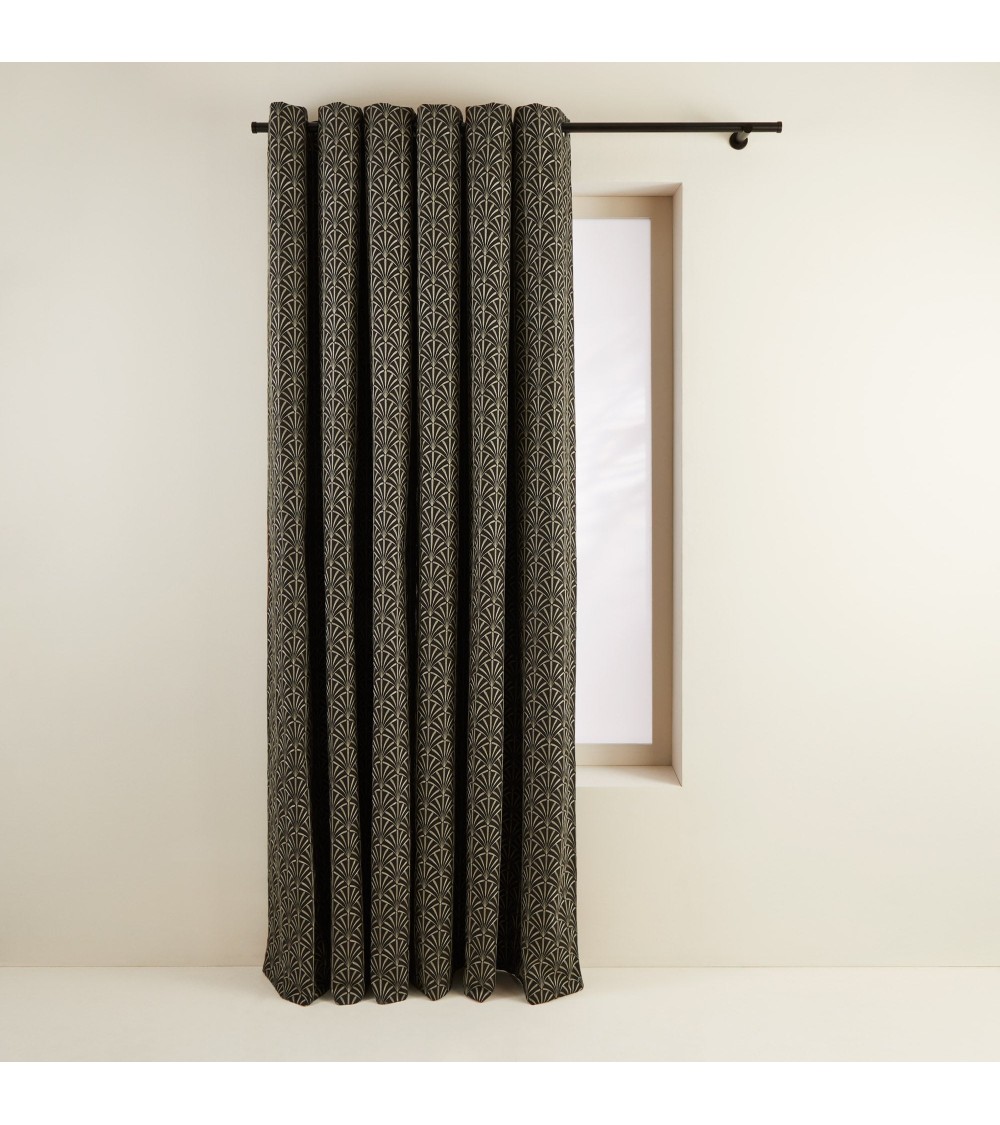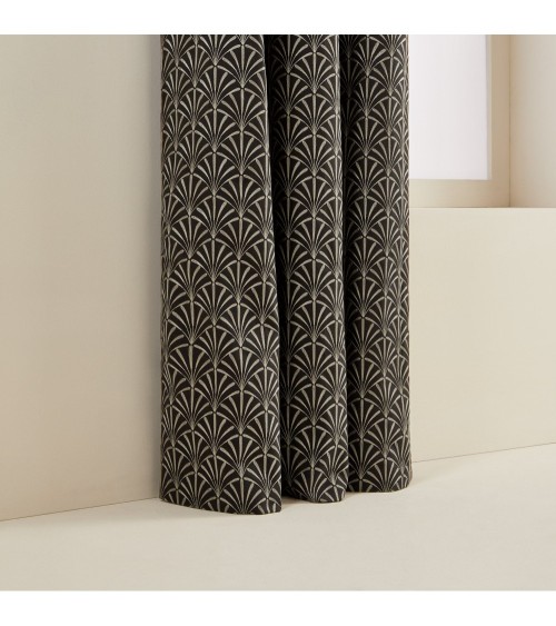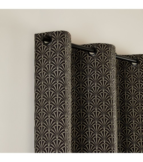 Cette ligne de rideau et coussin , brodée dun motif écailles aux influences art déco, donne à nos intérieurs une certaine idée du chic. Le tissu noir fluide est orné dune fine broderie de fil satiné coloris champagne, pour une allure digne des années folles. NOUVEAUTÉ, ce rideau est confectionné avec des oeillets noirs. Les graphismes art déco, très en vogue, pour un style retro chic assuré. Lalliance de couleurs noir et champagne doré apporte une préciosité moderne. La broderie all over ultra légère conserve le bel aspect souple de létoffe.