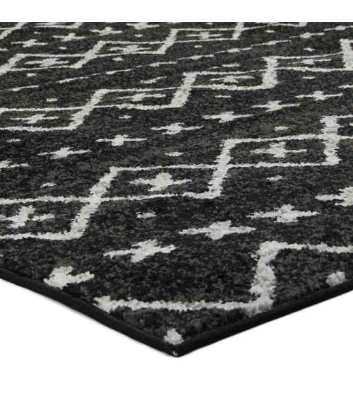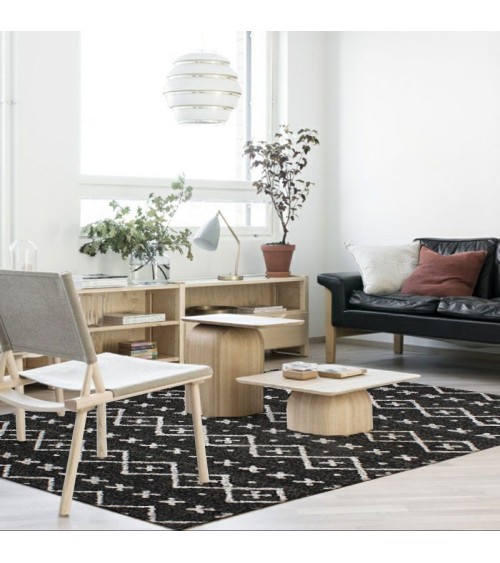Tapis d'aspect laine au toucher moelleux et à motifs graphiques géométriques blanc inspirés du style ethnique. Ce grand tapis noir apportera du caractère et du charme à votre intérieur.