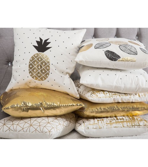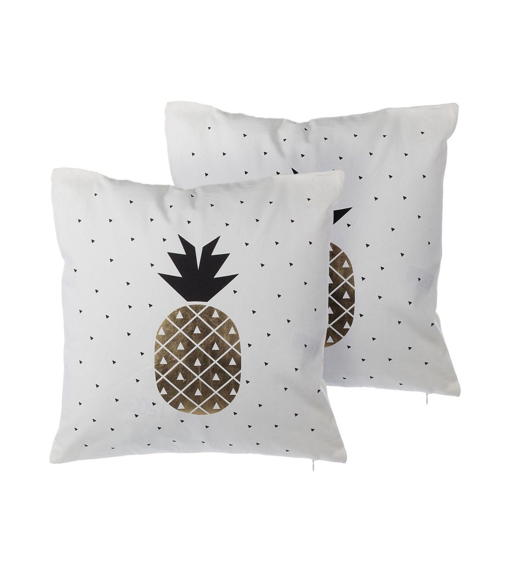 2 coussins décoratifs blancs avec motif ananas noir et doré 45 x 45 cm. Apportez une touche glamour à votre intérieur ! Ces coussins décoratifs au motif d'ananas doré ajouteront un accent exotique à votre salon ou chambre. Les housses de ces jolis coussins déco sont amovibles, donc si vous désirez changer d'ambiance, il vous suffira juste de retirer les housses et d'enfiler de nouvelles taies aux dimensions 45 x 45 cm.Détails: Type de produit: Coussin décoratif Style: Scandinave Couleur principale: Blanc Type de matière: Tissu Matière principale: Coton Matière du rembourrage: Polyester Composition de la matière: 100% Coton Forme: Carré Fabriqué à la main: Non Motif: Motif de feuille Dimensions: Profondeur: 45 cm Largeur: 45 cm Hauteur: 12 cm Poids du rembourrage: 350 kg Poids: 0.6 kg L`offre inclue: 2 x Oreiller Caractéristiques clés: Design et couleur tendance, Décoratif et fonctionnel, Un facteur de confort dans votre intérieur, Solution parfaite pour la chambre et le salon, Housses de coussin aux coutures cachées et fermetures éclair discrètes Informations d`assemblage: Ne nécessite pas d'assemblage Informations supplémentaires: Le coussin est scellé sous vide pour le transport. Veuillez retirer le coussin de l'emballage et le laisser reposer pendant 24 heures jusqu'à ce qu'il atteigne sa pleine densité. Conseils de maintenance: Coton: 1.Lavage à la main uniquement. Utilisez de l'eau froide et un nettoyant doux 2.Ne pas sécher en machine et ne pas repasser.