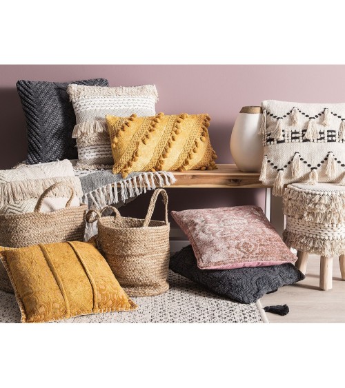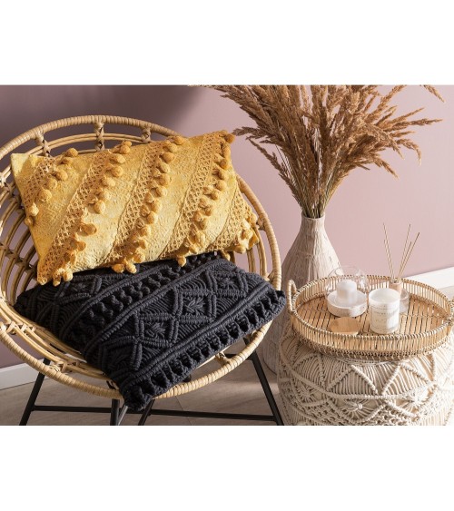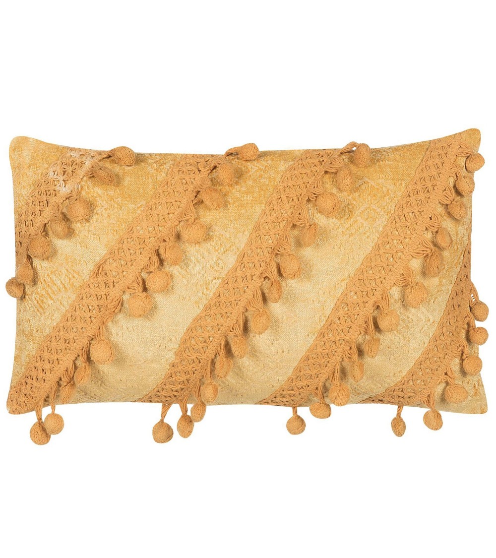 Coussin décoratif oriental en viscose jaune avec pompons. Ajoutez une touche bohème à votre intérieur avec ce joli coussin. Doté de pompons, il s'intègre parfaitement dans les chambres d'inspiration rustique ou bohème, et a fière allure associé à des accessoires similaires. Il est fait de mélange de viscose et de coton, ce qui le rend très agréable au toucher.Détails: Type de produit: Coussin décoratif Style: Boho Couleur principale: Jaune Nuance: Moutarde Type de matière: Tissu Matière principale: Soie artificielle Matière secondaire: Polypropylène Matière du rembourrage: Polyester Composition de la matière: 80% Viscose Forme: Rectangulaire Fabriqué à la main: Non Motif: Unicolore Dimensions: Profondeur: 50 cm Largeur: 30 cm Hauteur: 10 cm Poids du rembourrage: 450 kg Poids: 0.6 kg L`offre inclue: 1 x Oreiller Caractéristiques clés: Housse amovible, Crée une ambiance agréable, Décoratif et fonctionnel, Solution parfaite pour la chambre et le salon, Matières robustes faciles à entretenir Informations d`assemblage: Ne nécessite pas d'assemblage Informations supplémentaires: Le coussin est scellé sous vide pour le transport. Veuillez retirer le coussin de l'emballage et le laisser reposer pendant 24 heures jusqu'à ce qu'il atteigne sa pleine densité. Conseils de maintenance: Soie artificielle: 1.Ne pas sécher en machine et ne pas repasser 2.Lavage à la main uniquement. Utilisez de l'eau froide et un nettoyant doux.
