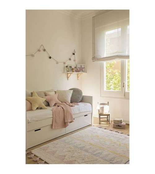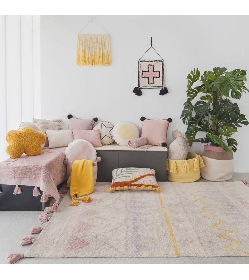 Base de couleur naturelle avec des triangles et des lignes en zigzag en Jaune, Gris perle, Nude et Vintage Nude et des pompons en couleur Vintage Nude