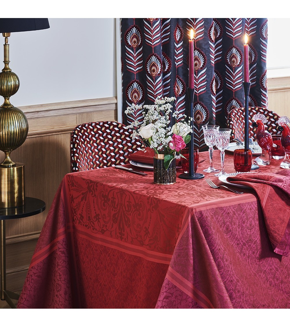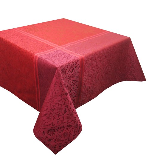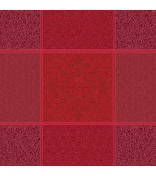 Nappe 100% coton damassé (jacquard) fabriquée en France à Gérardmer. Linge des Vosges. Cette nappe bénéficie du traitement anti-tache Green Sweet : votre linge de table reste propre et net. Matière : 100% coton peigné. Couleur dominante : grenat. Taille (largeur x longueur) : 172X172. Traitement : antitache déperlant. Type : jacquard. Style : Prestige. Finitions : Finitions raffinées avec coins capuchon. Ourlet de 15 mm pour les nappes rondes.. Grammage : . Entretien : En cas de tache, absorber délicatement les liquides ou tamponner avec une éponge humide après avoir retiré les éventuels éléments solides.Si nécessaire, laver en machine à 40°C avec un dosage de lessive normal. Sans adoucissant, ni détachant ni lingette de nettoyage.Sécher à température modérée.Repasser à fer très chaud, afin de réactiver la qualité du traitement.Cet article est labellisé Vosges Terre Textile. Il a été tissé dans nos ateliers de Gérardmer : véritable linge fabriqué dans les Vosges !