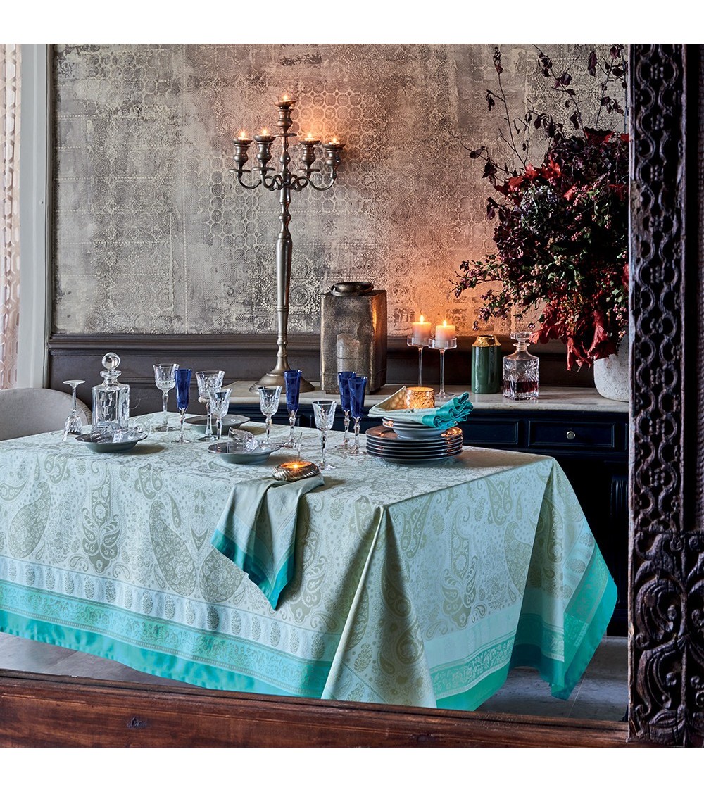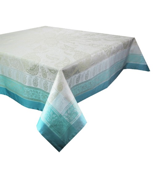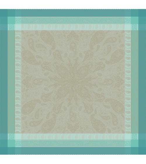 Nappe 100% coton damassé (jacquard) fabriquée en France à Gérardmer. Motifs dont la finesse est particulièrement mise en valeur par le tissage en compte serré. Cette nappe bénéficie du traitement anti-tache Green Sweet : votre linge de table reste propre et net. Matière : 100% coton peigné. Couleur dominante : lagon. Taille (largeur x longueur) : 174x174. Traitement : antitache déperlant. Type : jacquard tissage fin. Style : Prestige. Finitions : Finitions raffinées avec coins capuchons. Grammage : . Entretien : En cas de tache, absorber délicatement les liquides ou tamponner avec une éponge humide après avoir retiré les éventuels éléments solides.Si nécessaire, laver en machine à 40°C avec un dosage de lessive normal. Sans adoucissant, ni détachant ni lingette de nettoyage.Sécher à température modérée.Repasser à fer très chaud, afin de réactiver la qualité du traitement.Cet article est labellisé Vosges Terre Textile. Il a été tissé dans nos ateliers de Gérardmer : véritable linge fabriqué dans les Vosges !