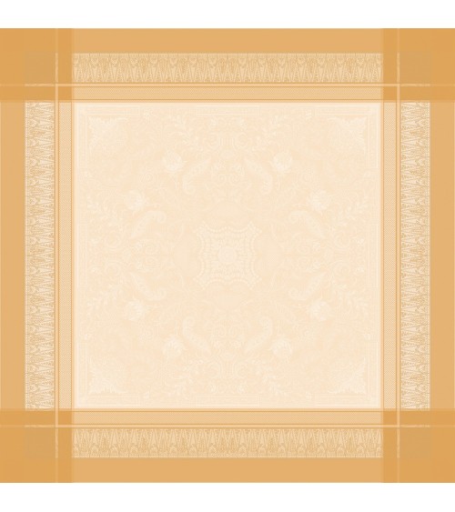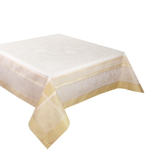 Nappe en coton damassé (jacquard) avec fils métalliques or. Qualité made in France. Motifs dont la finesse est particulièrement mise en valeur par le tissage en compte serré. Finitions raffinées avec des coins capuchons. Cette nappe bénéficie du traitement anti-tache Green Sweet : votre linge de table reste propre et net. Matière : 98% coton / 1% viscose / 1% polyester. Couleur dominante : or. Taille (largeur x longueur) : 174X364. Traitement : antitache déperlant. Type : jacquard tissage fin. Style : Prestige. Finitions : 98% coton / 1% viscose / 1% polyester. Finitions raffinées avec coins capuchons. Grammage : . Entretien : En cas de tache, absorber délicatement les liquides ou tamponner avec une éponge humide après avoir retiré les éventuels éléments solides.Si nécessaire, laver en machine à 40°C avec un dosage de lessive normal. Sans adoucissant, ni détachant ni lingette de nettoyage.Sécher à température modérée.Repasser à fer très chaud, afin de réactiver la qualité du traitement.Cet article est labellisé Vosges Terre Textile. Il a été tissé dans nos ateliers de Gérardmer : véritable linge fabriqué dans les Vosges !