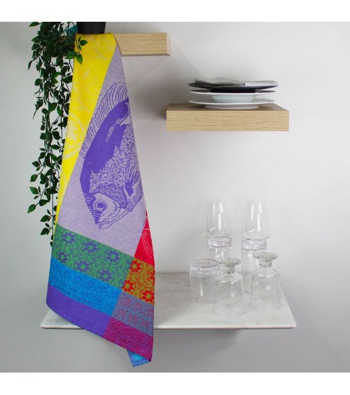 Torchon 100% coton damassé (jacquard) fabriqué en France. Linge des Vosges. Sur fond de frise de mosaïque, ce poisson à la plancha trône entre les rondelles de citrons et de tomates. La cuisine de l'été comme on l'aime : parfumée et colorée! 100% coton jacquard. Matière : 100% coton. Couleur dominante : turquoise. Taille (largeur x longueur) : 56x77. Traitement : . Type : jacquard. Style : Créatif. Finitions : Finition de qualité avec ourlet standard de 10 mm. Grammage : . Entretien : Laver séparément à 40°C avant la première utilisation. Une tache s'incruste plus facilement sur un linge non prélavé.Laver en machine avec une lessive couleurs pour le linge de couleur. Respecter les instructions de lavage de l'étiquette cousue sur le produit.Cet article est labellisé Vosges Terre Textile. Il a été tissé dans nos ateliers de Gérardmer : véritable linge fabriqué dans les Vosges !