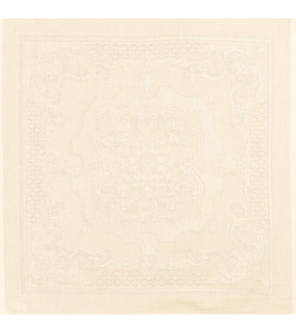 Serviette 100% coton damassé (jacquard) fabriquée en France à Gérardmer. Linge des Vosges. Matière : 100% coton peigné. Couleur dominante : ivoire. Taille (largeur x longueur) : 55x55. Traitement : . Type : jacquard. Style : Prestige. Finitions : Finitions raffinées avec coins capuchons. Grammage : . Entretien : Laver séparément à 40°C avant la première utilisation. Une tache s'incruste plus facilement sur un linge non prélavé.Laver en machine avec une lessive couleurs pour le linge de couleur. Respecter les instructions de lavage de l'étiquette cousue sur le produit.Cet article est labellisé Vosges Terre Textile. Il a été tissé dans nos ateliers de Gérardmer : véritable linge fabriqué dans les Vosges !