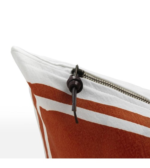 Housse de coussin en coton, au motif Cap Sa Sal avec sérigraphie et avec fermeture éclair en métal et détails en cuir. La conception du cadre de notre Cap Sa Sal nécessite une technique qui parvient à reproduire la couleur du design original. À cette occasion, nous avons eu recours à la sérigraphie. Un moule est généré, où chaque ligne est séparée par un vernis spécialement préparé. Une maille est tendue et rapprochée du coton. C'est le moment où l'encre envahit la maille et où les détails commencent à naître. Une raclette est utilisée pour répartir l'encre jusqu'à ce qu'elle recouvre tout. La touche finale est donnée par la séparation des mailles. Chaque coussin qui prend vie grâce à la sérigraphie est unique, car cette technique est reproduite individuellement.