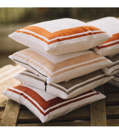 Housse de coussin en coton, au motif Cap Sa Sal avec sérigraphie et avec fermeture éclair en métal et détails en cuir. La conception du cadre de notre Cap Sa Sal nécessite une technique qui parvient à reproduire la couleur du design original. À cette occasion, nous avons eu recours à la sérigraphie. Un moule est généré, où chaque ligne est séparée par un vernis spécialement préparé. Une maille est tendue et rapprochée du coton. C'est le moment où l'encre envahit la maille et où les détails commencent à naître. Une raclette est utilisée pour répartir l'encre jusqu'à ce qu'elle recouvre tout. La touche finale est donnée par la séparation des mailles. Chaque coussin qui prend vie grâce à la sérigraphie est unique, car cette technique est reproduite individuellement.
