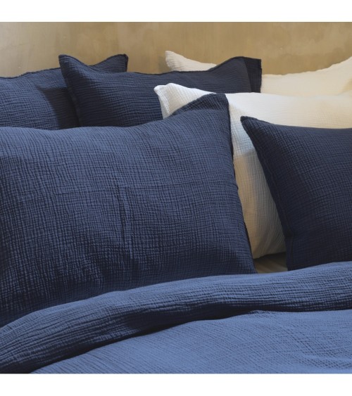Magnifique housse de couette en gaze de coton bleu nuit, très douce et moelleuse. Matière à l'aspect gaufré tendance et facile à vivre.