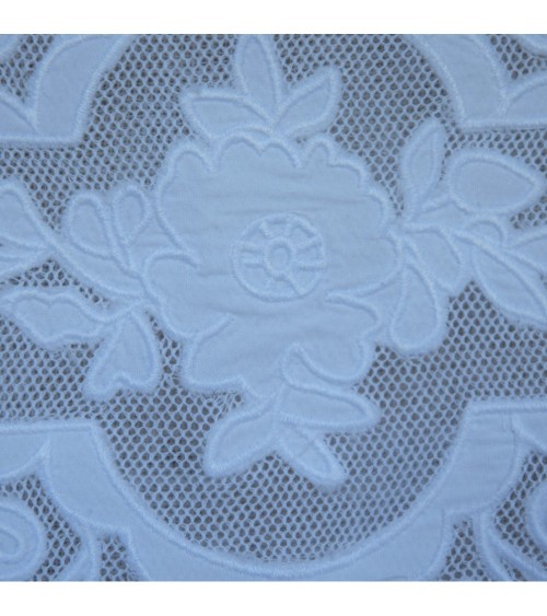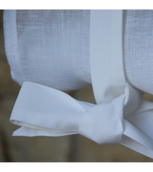 Ce store élégant en gaze de lin se distingue par un bandeau en coton blanc où se mêlent harmonieusement riches broderies sur filet et broderies richelieu aux motifs végétaux.