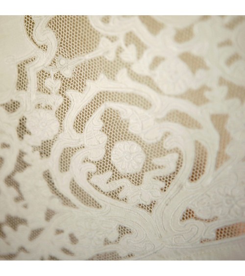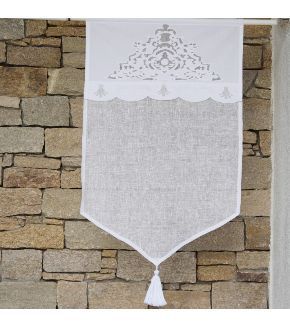 Un brise bise revisité: la gaze de lin blanc pur, orné sur la pointe d'un délicat pompon blanc, se fait élégante pour mettre en lumière un bandeau de coton orné de délicates broderies sur filet.