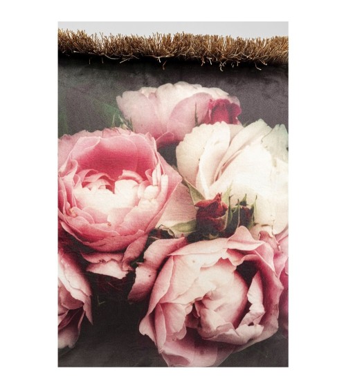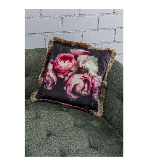 Ce coussin allie l'élégance de franges dorées et d'imprimés pivoines sur un fond noir.