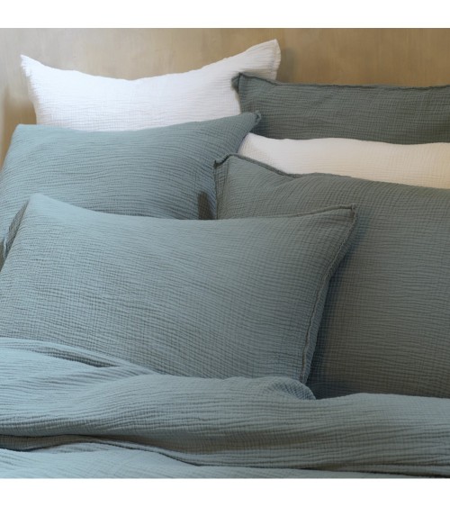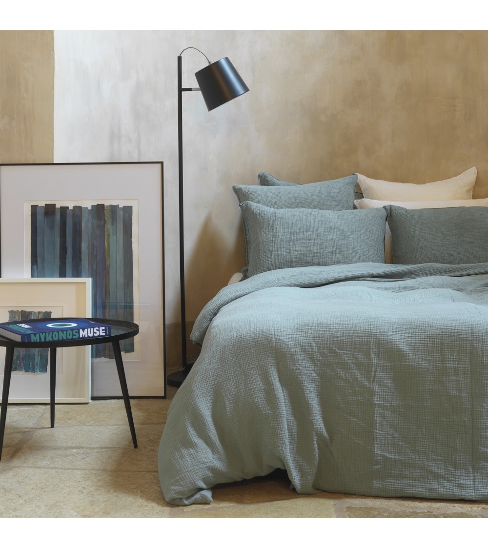 Magnifique housse de couette en gaze de coton bleu minéral, très douce et moelleuse. Matière à l'aspect gaufré tendance et facile à vivre.