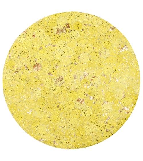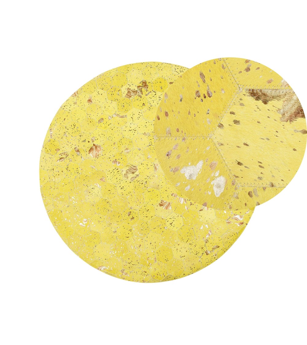 Embellissez votre intérieur avec ce magnifique tapis jaune. Doté d'une forme ronde élégante et d'un motif à nid d'abeille intéressant, il conviendra parfaitement à tout intérieur contemporain ou traditionnel. Le tapis est fabriqué à partir du cuir véritable durable de haute qualité et comporte de petits accents décoratifs dorés. Ajoutez un peu de style à votre maison avec ce tapis moderne.