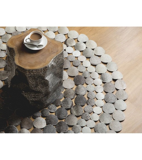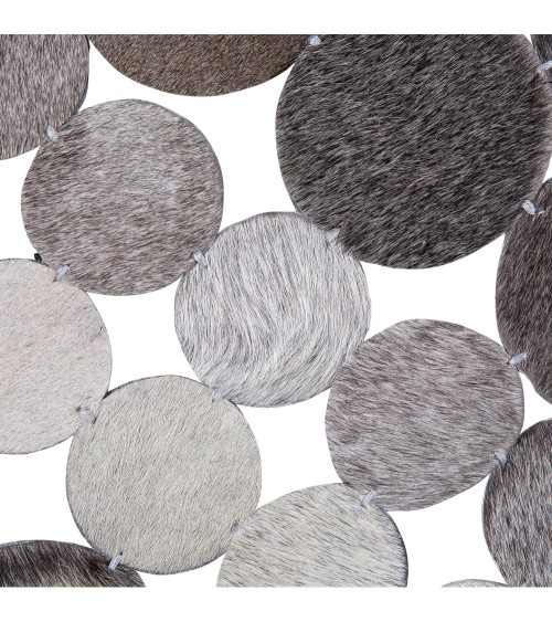 Un design tendance et un matériau de haute qualité, robuste et facile d'entretien vont de pair avec ce tapis rond fait à la main. Il se compose de plusieurs pièces rondes en cuir qui ont été assemblées de manière circulaire. Les nuances de gris clair et foncé apportent une atmosphère agréable. Un vrai bijou pour tous les styles de décoration, il s'adapte à tout type de pièce comme dans une cuisine ou sous une table basse. Il possède un revêtement verso doux en simili cuir. Les couleurs et les motifs peuvent différer de la photo car chaque tapis est fait à la main.