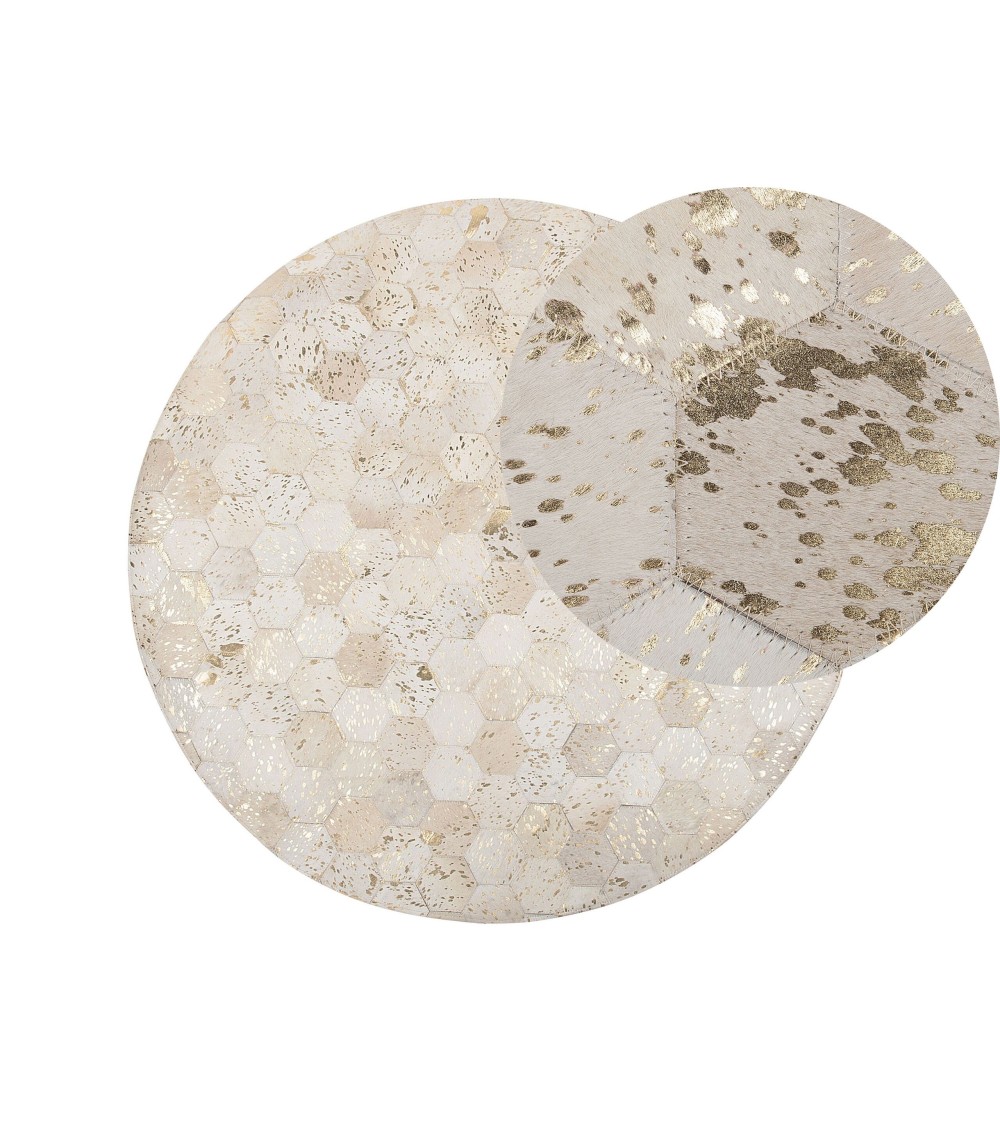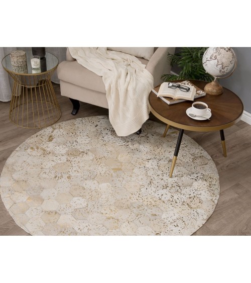 Embellissez votre intérieur avec ce magnifique tapis beige et gris. Doté d'une forme ronde élégante et d'un motif à nid d'abeille intéressant, il conviendra parfaitement à tout intérieur contemporain ou traditionnel. Le tapis est fabriqué à partir du cuir véritable durable de haute qualité et comporte de petits accents décoratifs dorés. Ajoutez un peu de style à votre maison avec ce tapis moderne.