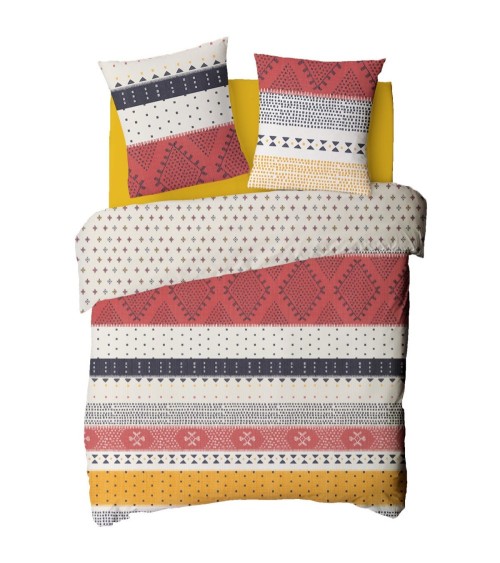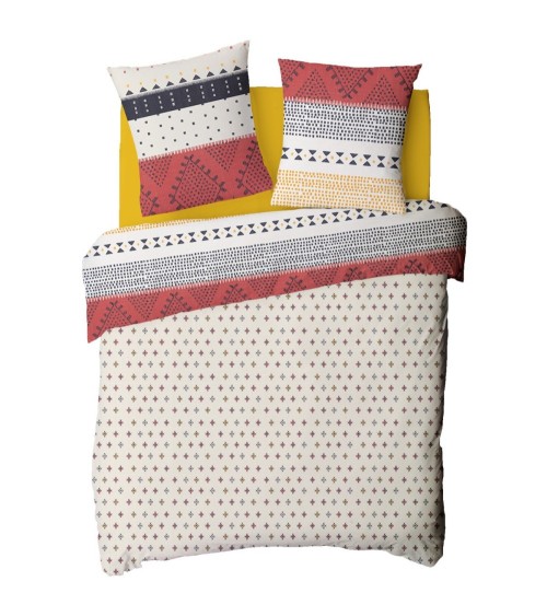 Parure de lit en polycoton réversible imprimé 57 fils blanc et terracotta comprenant 1 housse de couette + 1 taie d'oreiller 63x63cm.La parure de lit Chamarel s'inspire d'un endroit magique au cur de l'île Maurice. Le temps d'une nuit, évadez-vous dans ses terres ocres, oscillant sur les draps entre le terracotta, le noir et quelques touches orangées. Notre parure est composée d'une housse de couette finition boutons qui sécurisera votre couette en toutes circonstances. La taie d'oreiller assortie à la housse de couette et aux dimensions 63x63cm s'associe parfaitement avec le style coloré de ce linge de lit.A compléter avec nos drap-housse FUTURE HOME.COMPOSITIONS PRODUIT : Matière : 52% polyester, 48% coton Couleurs : Blanc et terracotta Densité fils : 57 fils/cm² Certification : OEKO-TEX® Lavage : à 60° en machine 2 taies d'oreiller 63x63cmVous faites attention à l'environnement ? Ca tombe bien, nous aussi ! La parure de lit CHAMAREL vous est envoyée dans un pochon en tissu réutilisable, aux motifs de la housse de couette, et transformable en tote-bag une fois que vos draps trôneront fièrement sur votre lit. Un geste pour l'environnement, et d'infinies possibilités de réutiliser votre nouveau sac !En savoir plus : Ce produit labélisé STANDARD 100 by OEKO-TEX® - certificat n° 18.HPK48415 HOHENSTEIN HTTI suit un processus de fabrication certifié et contrôlé, respectueux de votre peau. Le STANDARD 100 by OEKO-TEX® EST un label qui vous garantit que vos draps ne contiennent aucun produits toxiques ni pour votre santé, ni pour l'environnement.