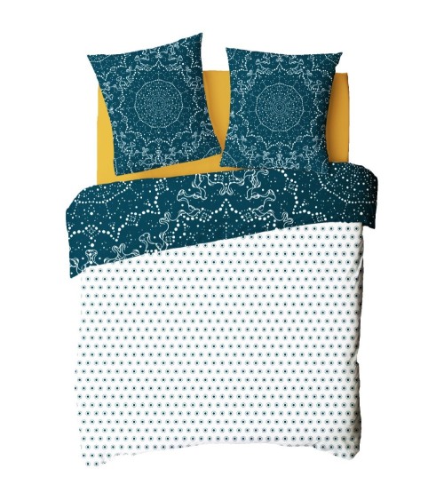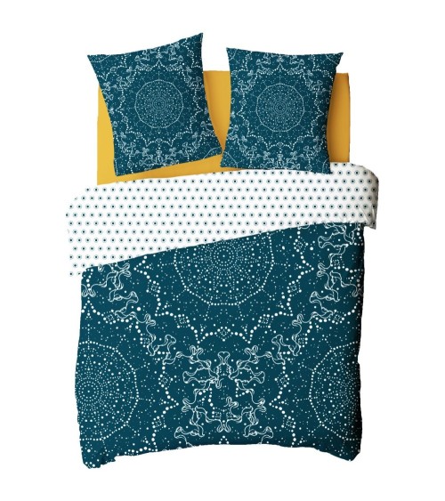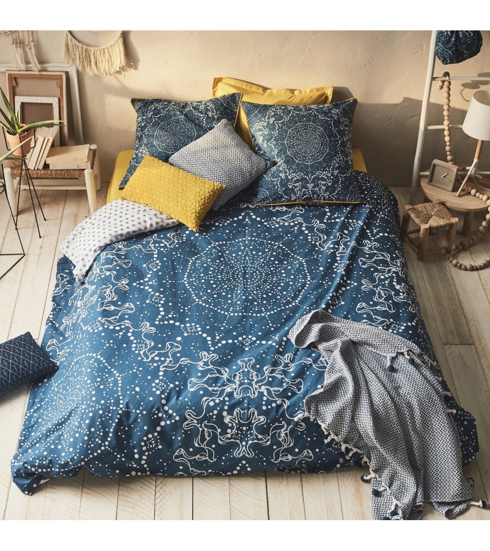 Parure de lit en coton réversible imprimé 57 fils bleu comprenant 1 housse de couette + 2 taies d'oreiller 63x63cm.Notre parure de lit Callisto comporte un jeu de couleurs profondes, influencé par la tendance astrale, dans laquelle notre parure se fond à la perfection. Le linge de lit Callisto est en 100% coton avec une qualité de tissage supérieure de 57 fils/cm². Un toucher d'une douceur incomparable, qui vous donnera envie de prolonger toutes vos nuits dans les draps de Morphée. La parure de lit Callisto est composée d'une housse de couette finitions boutons qui sauvera votre couette d'une évasion certaine. Les taies d'oreiller réversibles aux dimensions 63x63cm s'associent avec le style ethnique de ce linge de lit décidément unique.A compléter avec nos drap-housse FUTURE HOME.COMPOSITIONS PRODUIT : Matière : 100% coton Couleurs : Bleu Densité fils : 57 fils/cm² Certification : OEKO-TEX® Lavage : à 60° en machine 2 taies d'oreiller 63x63cmVous faites attention à l'environnement ? Ca tombe bien, nous aussi ! La parure de lit CALLISTO vous est envoyée dans un pochon en tissu réutilisable, aux motifs de la housse de couette, et transformable en tote-bag une fois que vos draps trôneront fièrement sur votre lit. Un geste pour l'environnement, et d'infinies possibilités de réutiliser votre nouveau sac !En savoir plus : Ce produit labélisé STANDARD 100 by OEKO-TEX® - certificat n° 18.HPK48415 HOHENSTEIN HTTI suit un processus de fabrication certifié et contrôlé, respectueux de votre peau. Le STANDARD 100 by OEKO-TEX® EST un label qui vous garantit que vos draps ne contiennent aucun produits toxiques ni pour votre santé, ni pour l'environnement.