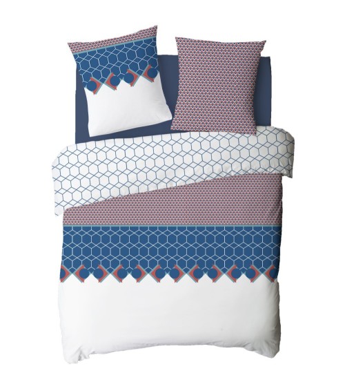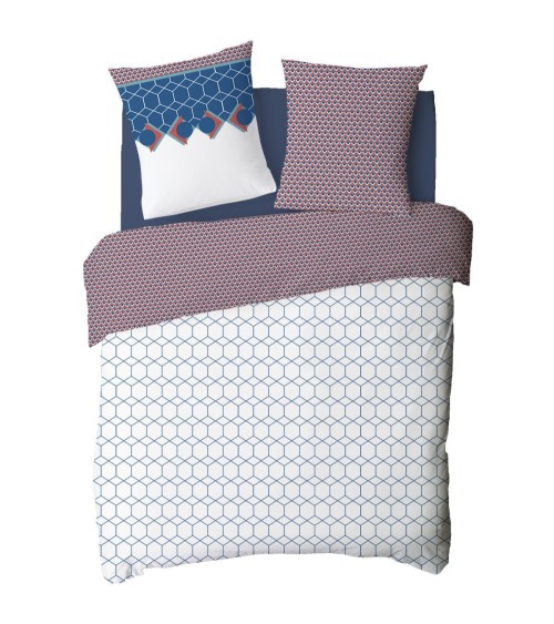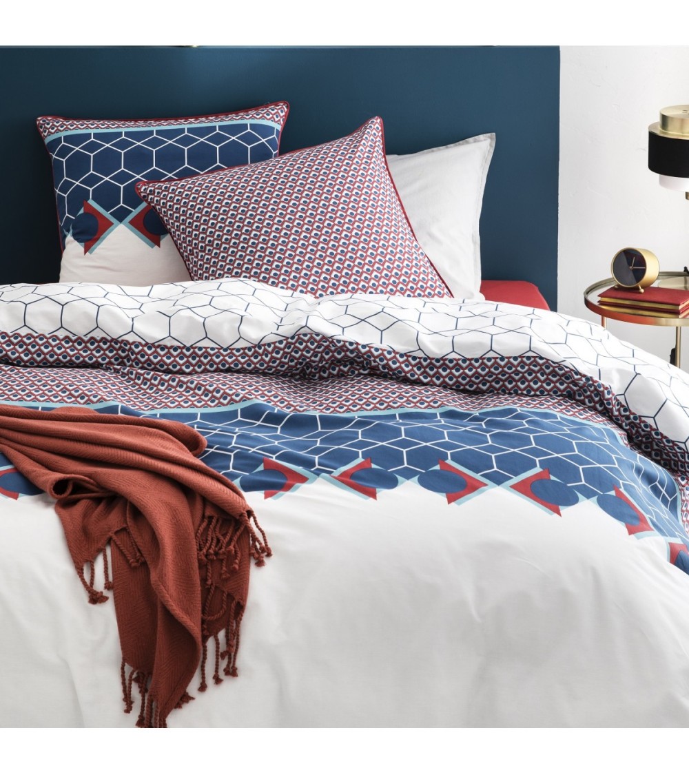 Parure de lit en coton réversible imprimé graphique 57 fils blanc et terracotta comprenant 1 housse de couette + 2 taies d'oreiller 63x63cm.La parure de lit Moderno n'a jamais aussi bien porté son nom. Que l'on parle de ses couleurs terracottas et bleus électrique ou de son style moderne et graphique : tout est dans l'air du temps. Sa housse de couette réversible se transforme en un motif nid d'abeille graphique, intemporel. Le linge de lit Moderno est en 100% coton avec une qualité de tissage de 57 fils/cm². Pour des centaines de nuits dans un océan de douceur.Notre parure est composée d'une housse de couette finitions bouton qui sauvera votre couette d'une évasion certaine. Les taies d'oreiller réversibles aux dimensions 63x63cm sont bordées d'une finitions biais plat terracotta venant parfaire le style moderne et élégant de la housse. A compléter avec nos drap-housse FUTURE HOME.COMPOSITIONS PRODUIT : Matière : 100% coton Couleurs : Blanc et terracotta Densité fils : 57 fils/cm² Certification : OEKO-TEX® Lavage : à 60° en machine 2 taies d'oreiller 63x63cm finition biais platVous faites attention à l'environnement ? Ca tombe bien, nous aussi ! La parure de lit MODERNO vous est envoyée dans un pochon en tissu réutilisable, aux motifs de la housse de couette, et transformable en tote-bag une fois que vos draps trôneront fièrement sur votre lit. Un geste pour l'environnement, et d'infinies possibilités de réutiliser votre nouveau sac !En savoir plus : Ce produit labélisé STANDARD 100 by OEKO-TEX® - certificat n° 18.HPK48415 HOHENSTEIN HTTI suit un processus de fabrication certifié et contrôlé, respectueux de votre peau. Le STANDARD 100 by OEKO-TEX® EST un label qui vous garantit que vos draps ne contiennent aucun produits toxiques ni pour votre santé, ni pour l'environnement.