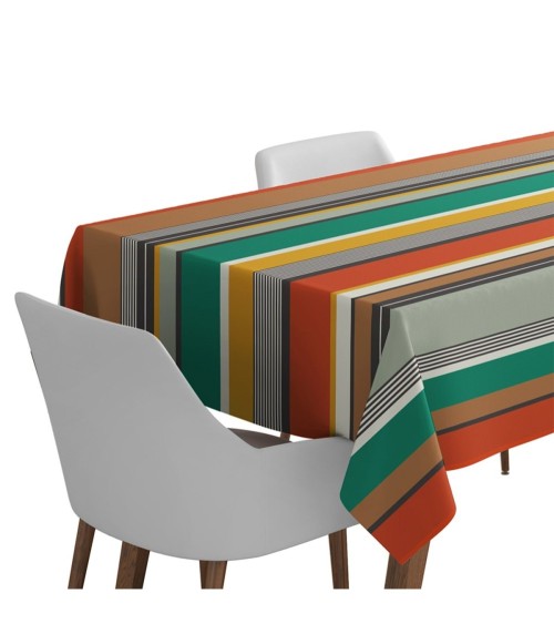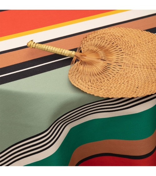 Découvrez notre nouvelle nappe enduite Oleta Kanouga colorée et vive. Une nappe enduite rayée et tissée qui s'accordera parfaitement à votre table de déjeuner en intérieur ou extérieur.