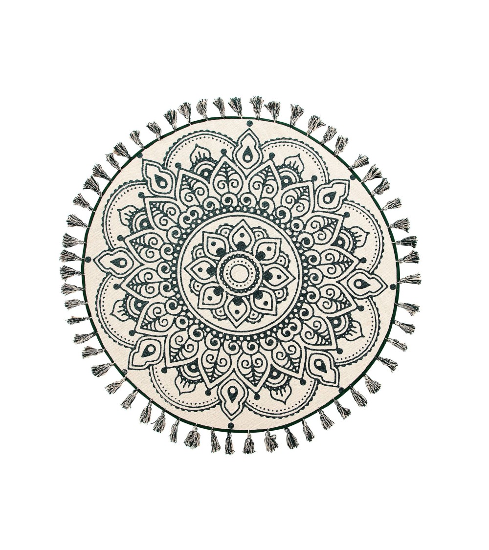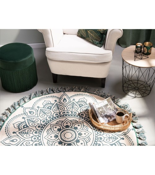 Inspiré par l'Orient, ce beau tapis à franges embellira chaque intérieur. L'imprimé au style mandala en vert sur une base de couleur crème crée une composition intéressante destinée à attirer l'attention et à améliorer l'apparence de l'environnement le plus proche. Ce tapis tapis original et unique en son genre est fait à la main à partir de coton naturel à la fois décoratif et durable.