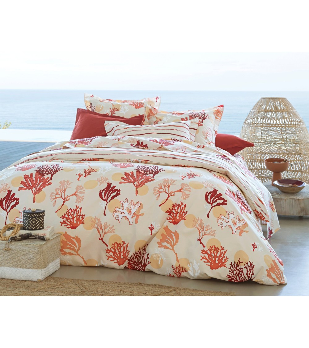 Rêvez de contrées lointaines avec le motif original de cette Housse de couette 260x240 en percale de coton corail. On craque pour la percale de pur coton, une toile de très belle qualité au motif marin, recto imprimé motif corail, verso rayures vagues. Cette housse de couette imprimée en percale de pur coton au tissage de 80 fils/cm² est lavable à 60°, munie dun rabat de 40 cm.