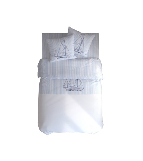 Emmenez vos rêves vers les bords de mer avec cette Housse de couette 140x200 en coton bleu. Une housse de couette en pur coton au tissage de 57 fils/cm2, lavable à 60°, munie dun rabat de 40 cm. Une housse de couette à rayures avec bateau brodé sur la partie haute et dos composé de rayures bleues et blanches.
