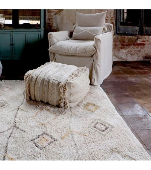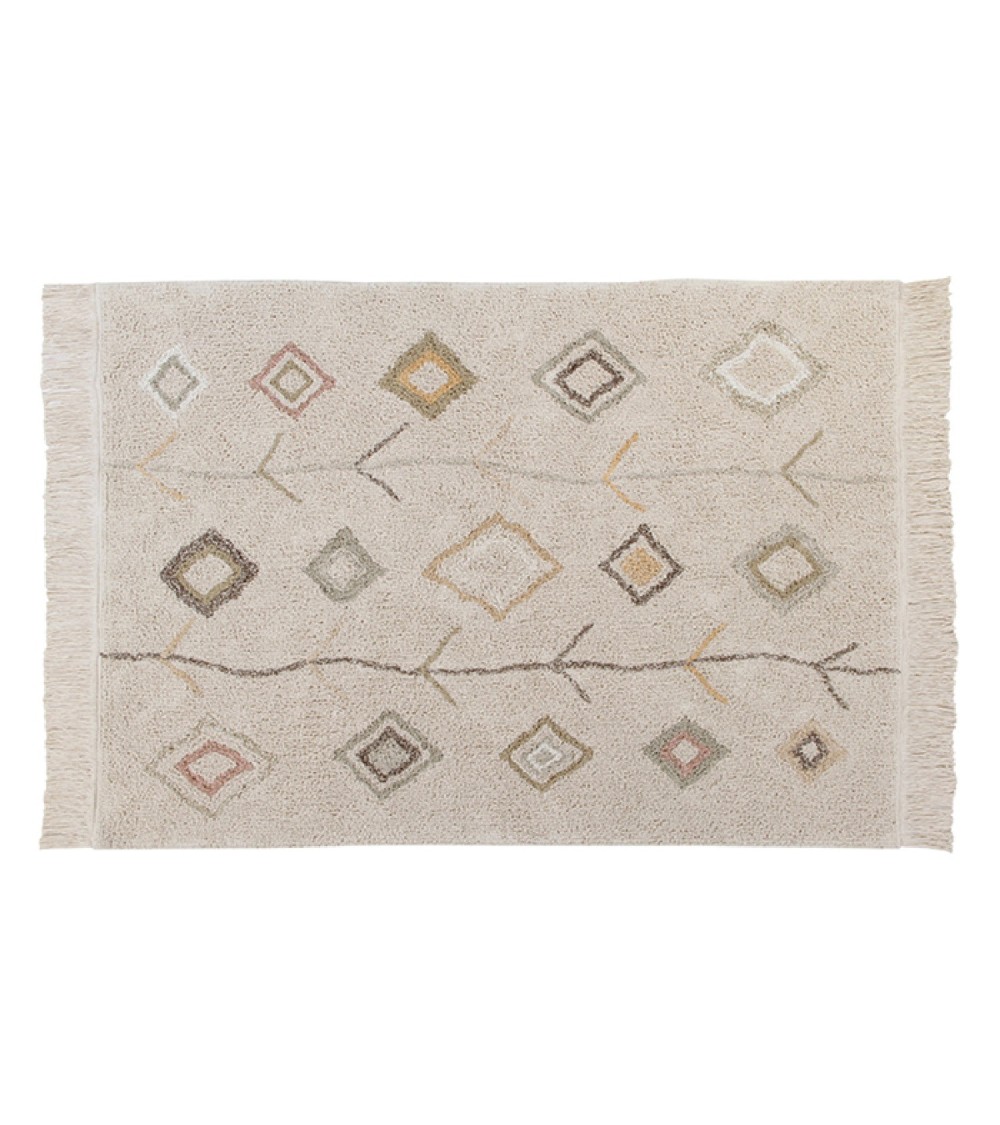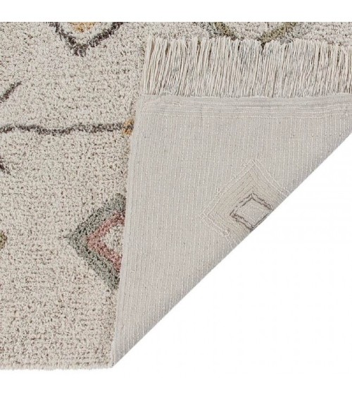 Tapis rectangulaire en coton doux avec base de couleur naturelle et motif design dans des couleurs douces et élégamment mélangées dans des tons terreux d'olive, de miel, de brun terre, d'ivoire et de nu vintage. Fini avec des franges de 10 cm de couleur naturelle sur les bords.