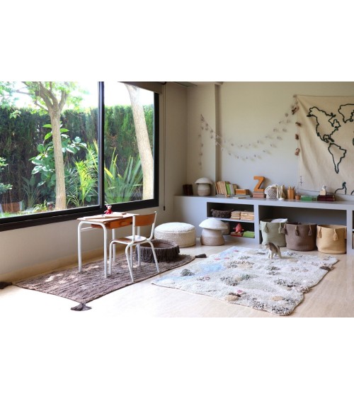 Le tapis Pine Tree a été inspiré par le cortex rugueux du pin, avec sa surface irrégulière et ses petites cachettes servant de foyer aux petits habitants des bois. Dans des tons bruns mélangés et de forme irrégulière, le tapis a des lignes vertes coupées courtes et irrégulières simulant le lichen, et est fini avec des pompons dans chaque coin.
