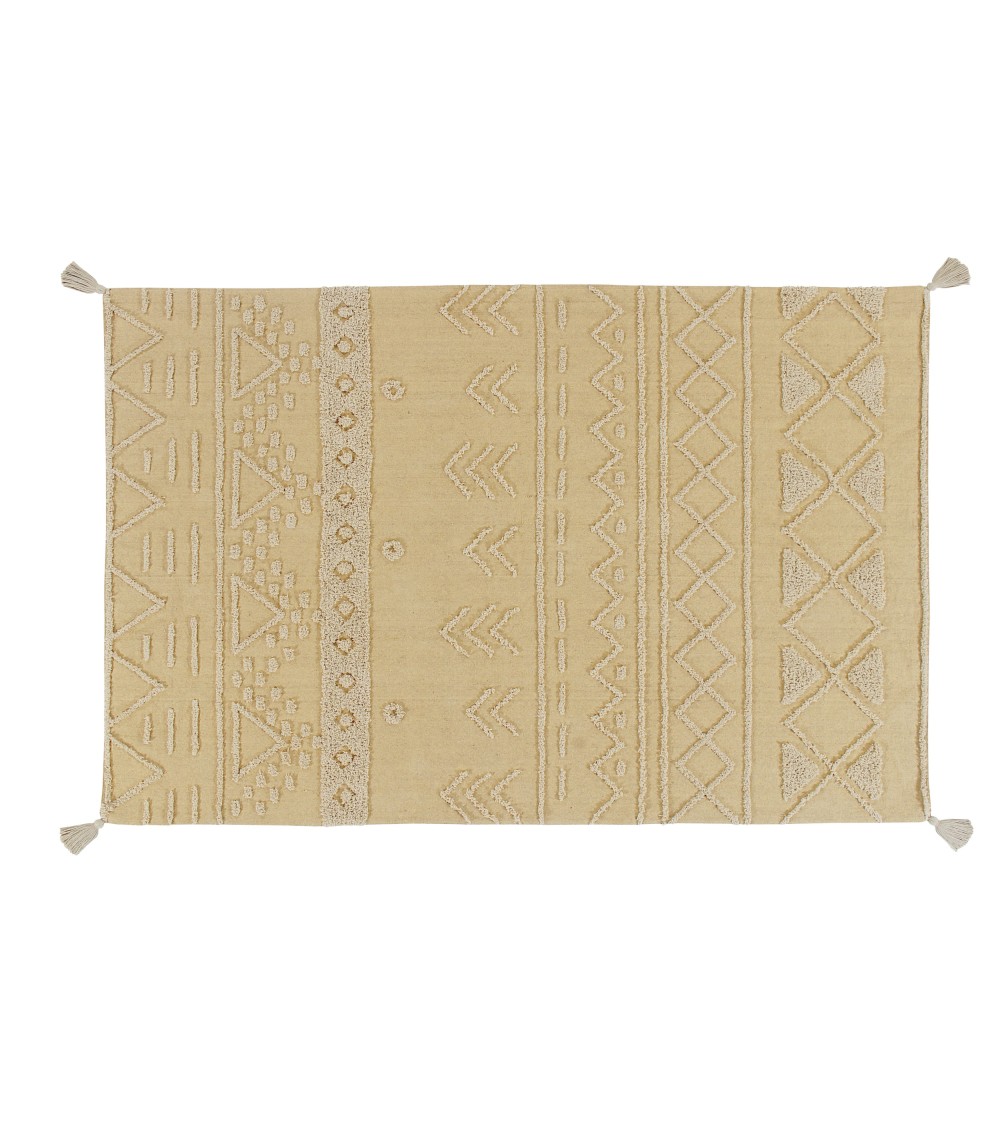 Tapis rectangulaire en coton avec base en toile de couleur mélangée visible dans les couleurs Honey et Soil Brown, avec un motif tribal sur le dessus en Honey. Fini avec un pompon dans chaque coin