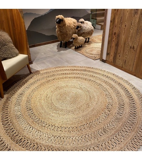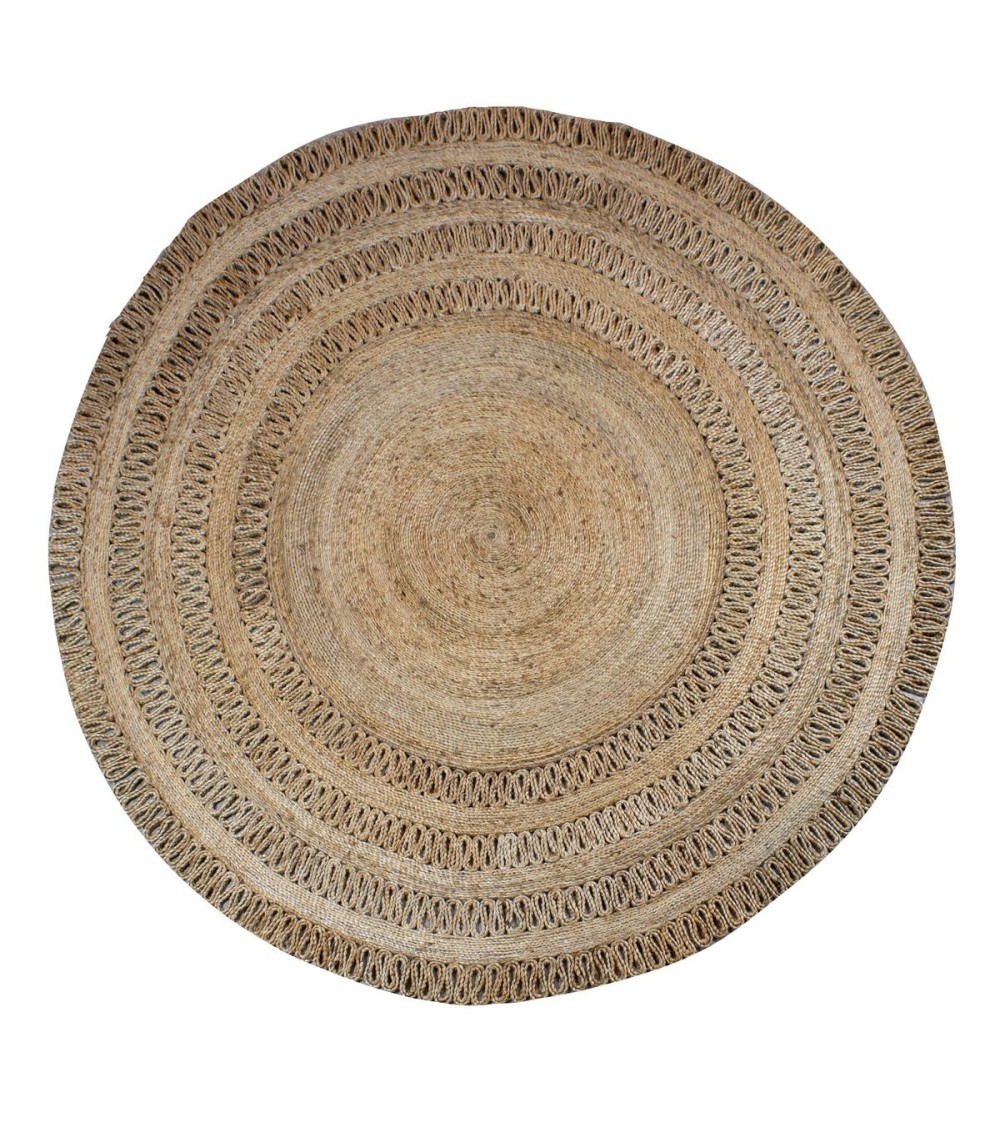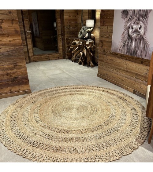 Notre tapis rond JERICO tréssé à la main, propose un design trés authentique et cosy pour la maison. Parfait pour apporter une note naturelle, de part sa conception 100% jute, il est totalement biodégradable et recyclable, est très respectueuse de l'environement. C'est un indispensable autant en hiver qu' en été. En hiver, il ajoute la touche cosy et chaleureuse, et sur le restant de l'année il sublime notre intérieur. Comme toutes les pièces tréssées à la main, il peut y avoir quelques imperfections ce qui n'enlève rien à leur charme unique. Tapis rond 100% jute naturelle. Tréssé à la main. Matière écologique, biodégradable et recyclable. Dimensions : Ø220cm Poids : 14.300 kgs Nettoyer à l'aide d'un chiffon sec