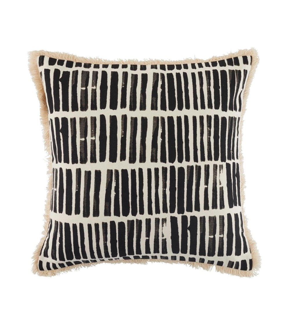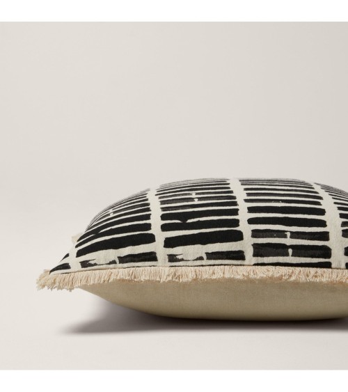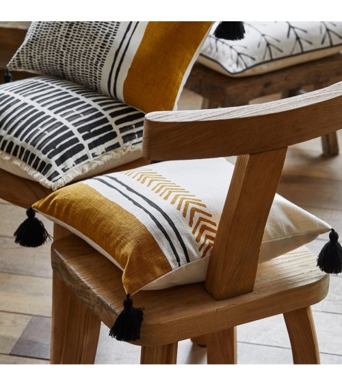 Le coussin KIMIA, avec sa finition frangée et son motif graphique en impression dans des teintes naturelles et noires apportera une touche ethnique chic en toute sobriété. On aime ce motif à la fois et sa composition 100% coton.