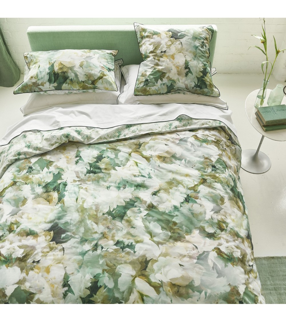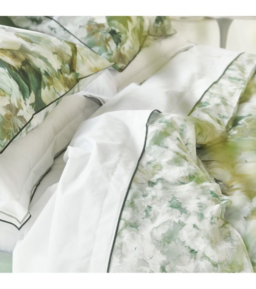 Le modèle Fleurs de jour a un riche motif floral abstrait à effet texturé incarnant un temps brumeux d'été. Des pivoines en fleurs élégamment teintées dans les tons céladon doux et sensuels, sublimées au verso par un imprimé neutre.