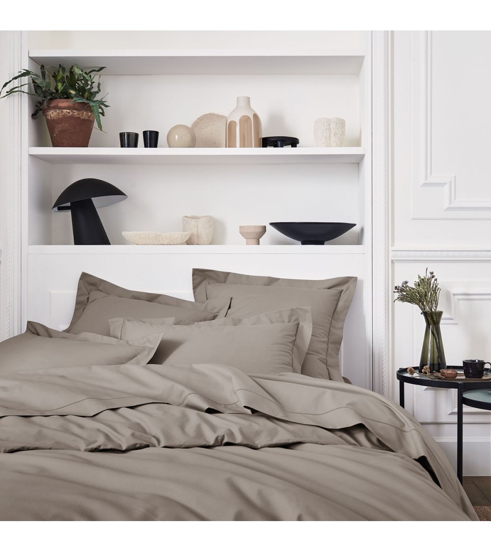 La housse de couette unie est soulignée d'un point de bourdon serré ton sur ton. La finition bouteille permet de rabattre le bout de la housse de couette en dessous du matelas afin d'en assurer son bon maintien.